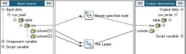 The logic compares the numeric value of "column[1]" with the value of "column[2]" of input data and output the larger one.